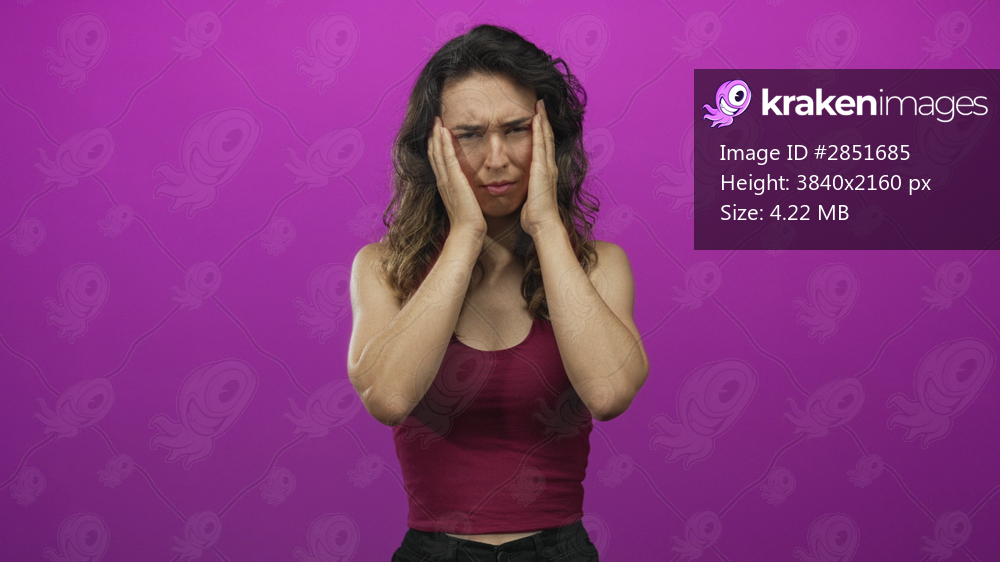 Young hispanic woman grimaces and holds temples with fingers in studio lit by magenta light; stress.