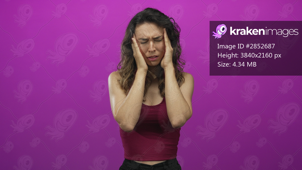 Young hispanic woman grimaces and holds temples with fingers in studio lit by magenta light; stress.