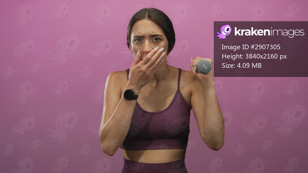 Young hispanic woman with hand covering mouth holding dumbbell in studio against pink backdrop; nausea discomfort.