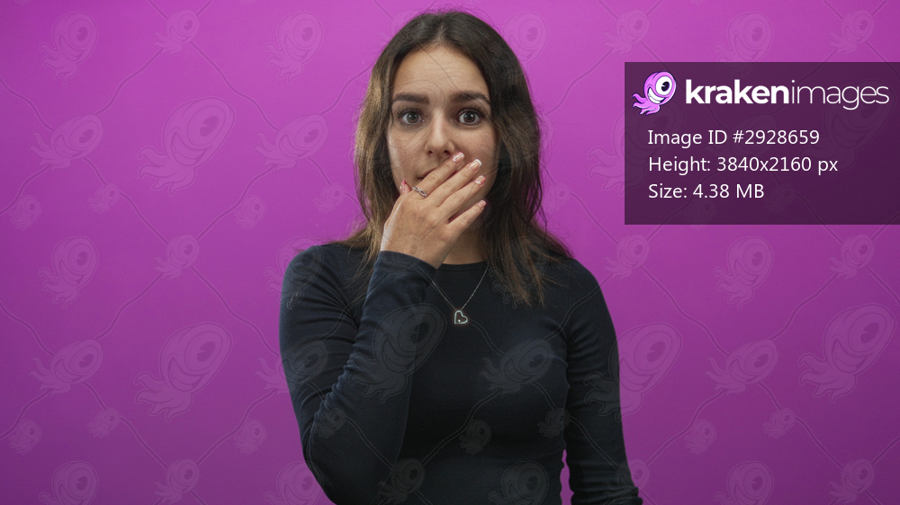 Young hispanic woman with hand covering mouth, wearing heart necklace and long sleeve shirt, looking surprised in purple studio; surprise.
