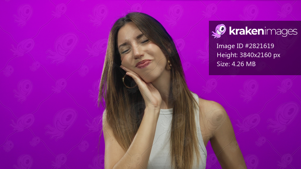 Young hispanic woman hand on cheek for toothache in purple studio setting with gold hoop earrings and white tank top; suffering health awareness prevention. - Kraken Images