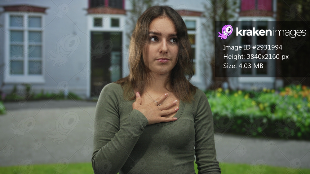 Young hispanic woman with hand on chest at building entrance outdoors by garden and lawn; surprise sincerity.