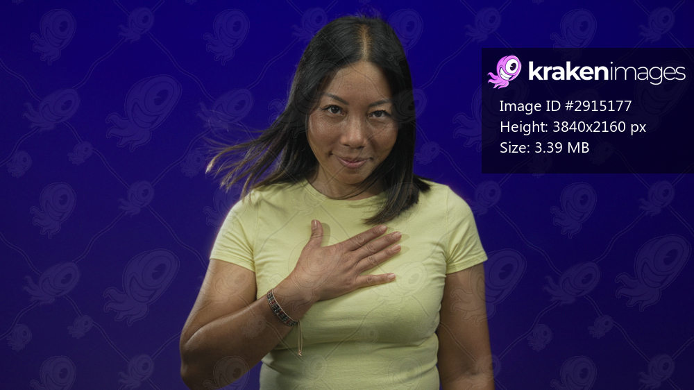Young hispanic woman with hand on chest in blue studio, wearing yellow tee and bracelet while hair lifts in breeze; gratitude sincerity calm.