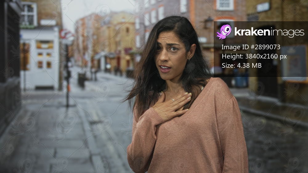 Young hispanic woman with hand on chest touching pink sweater on a wet city street, frowning with raised eyebrow and visible ring on finger; concern.