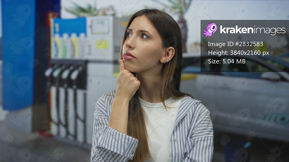 Young hispanic woman with hand on chin by fuel pump beside parked car at street petrol station; thinking.