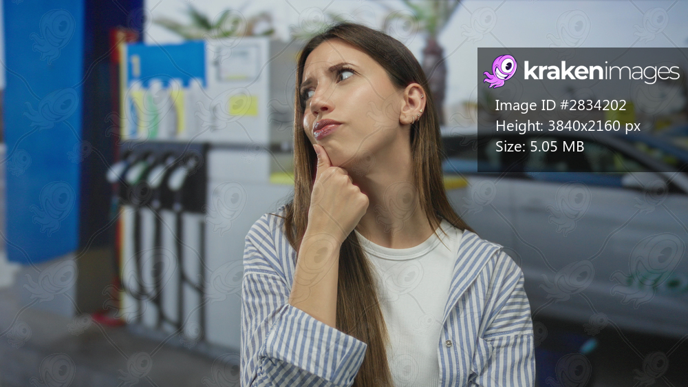 Young hispanic woman with hand on chin by fuel pump beside parked car at street petrol station; thinking.
