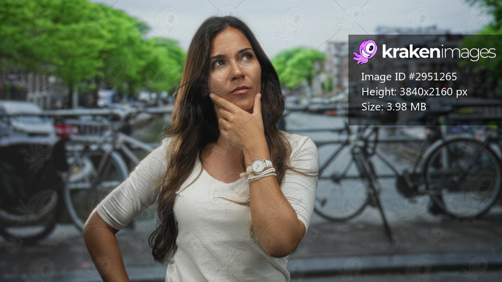Young hispanic woman with hand on chin and closed eyes, standing by parked bicycles on a street in amsterdam, wearing white top and wristwatch; contemplation. - Kraken Images