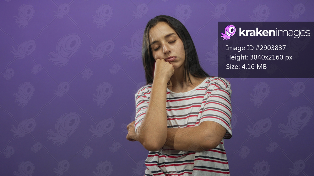 Young hispanic woman with hand on chin and closed eyes wearing striped shirt in purple studio; contemplation.