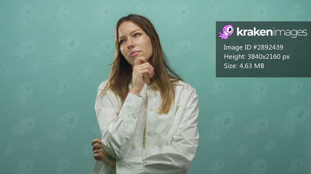 Young hispanic woman hand on chin with folded arms wearing white shirt in mint green studio; thoughtful contemplation.