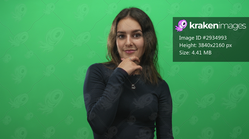 Young hispanic woman with hand on chin and heart necklace in studio against a bright green backdrop; thoughtful reflection.