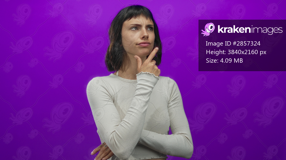 Young hispanic woman with hand on chin in purple studio, wearing a white long sleeve crop top; doubt introspection.