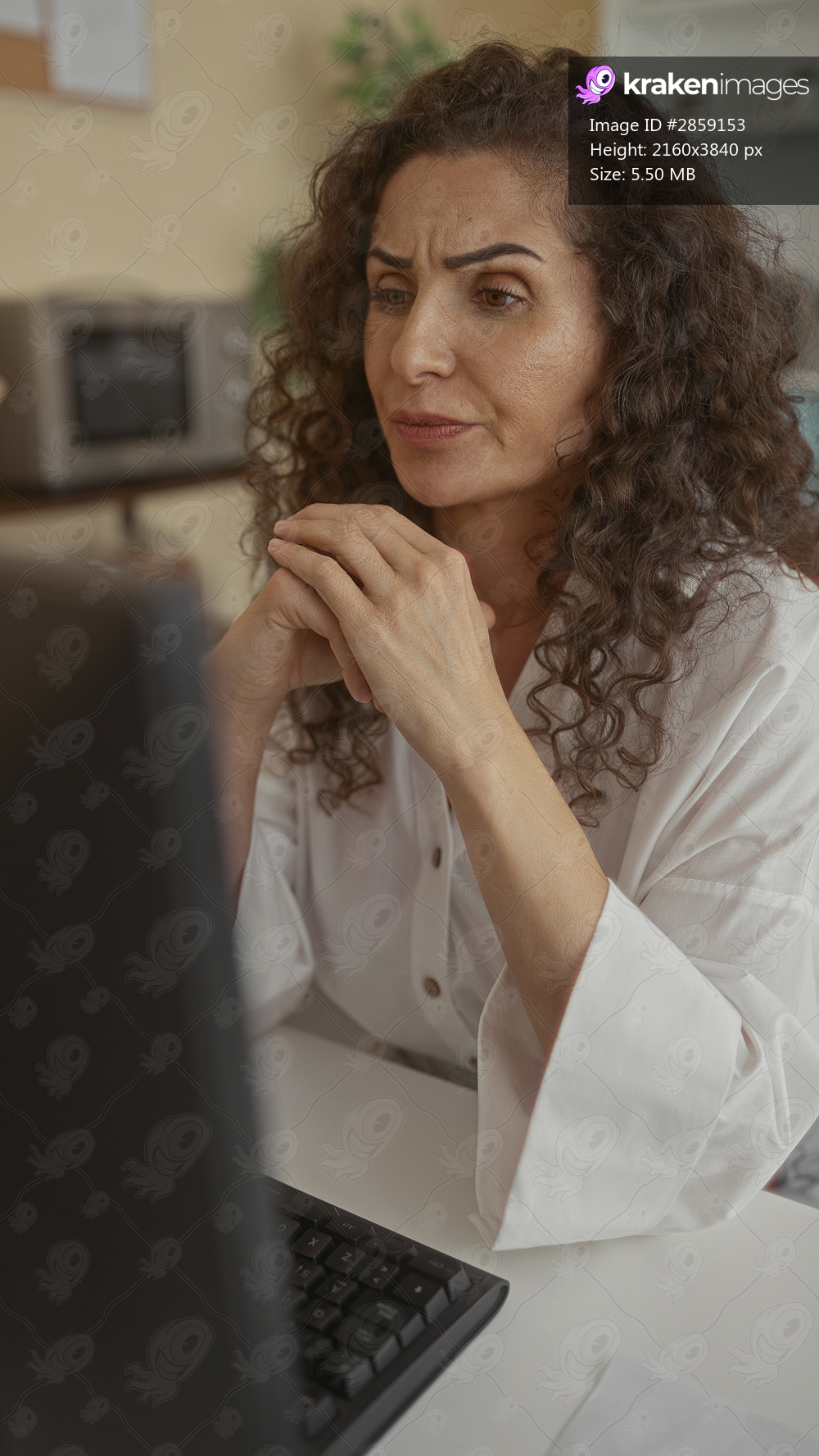 Young hispanic woman hand on chin looking at computer screen in bright office building; contemplation.