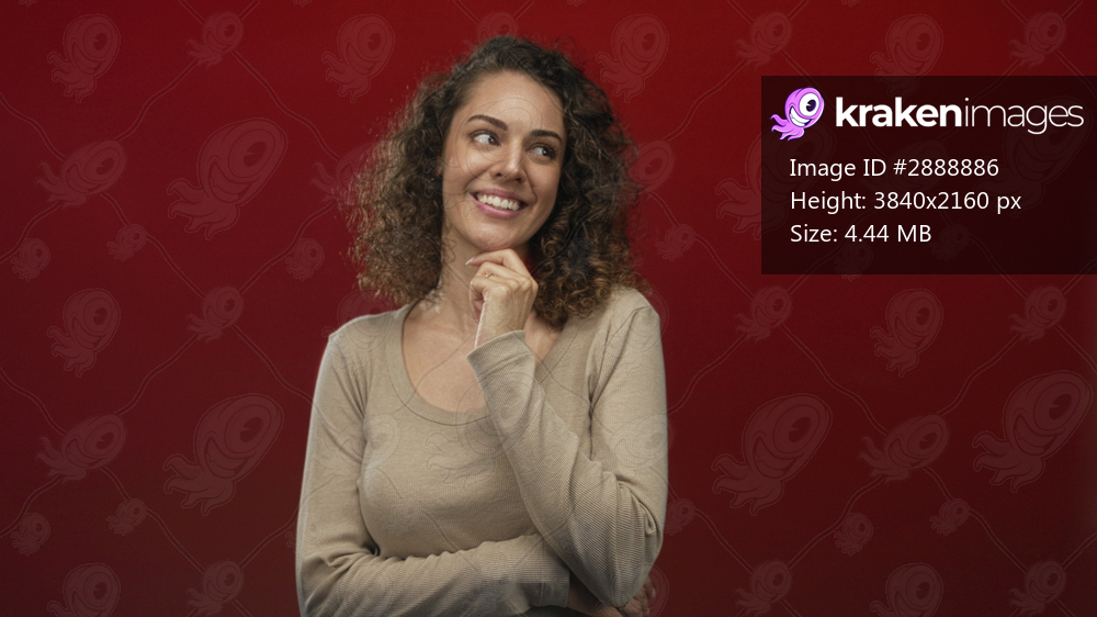 Young hispanic woman with hand on chin smiling, curly hair and beige top posed against a red studio wall; thoughtful curiosity.