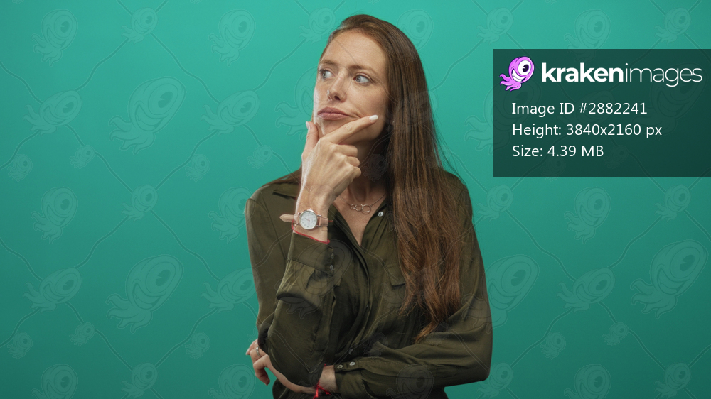 Young hispanic woman with hand on chin and visible wristwatch posed in teal green studio; thoughtful reflection.