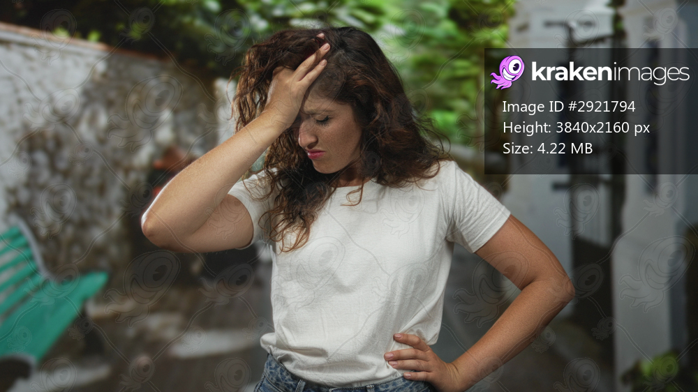 Young hispanic woman with hand on forehead for headache, other hand on hip, wearing white t shirt in narrow street; headache discomfort.