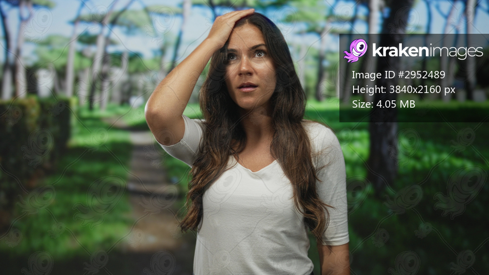 Young hispanic woman with hand on forehead in forest park path, mouth open and visibly wide eyed; surprise.