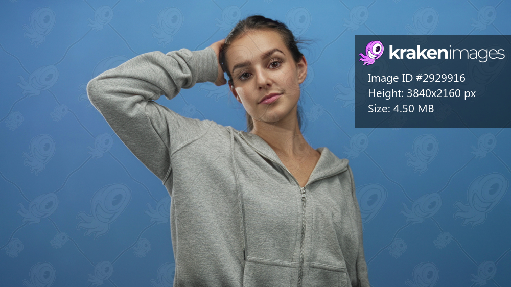 Young hispanic woman with hand on head wearing grey zip hoodie in blue studio, posing with ponytail and neutral smile; confidence self care.