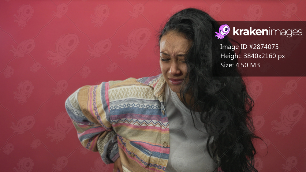Young hispanic woman with hand on lower back in pink studio wearing patterned shirt and hoop earrings; backache pain recovery.