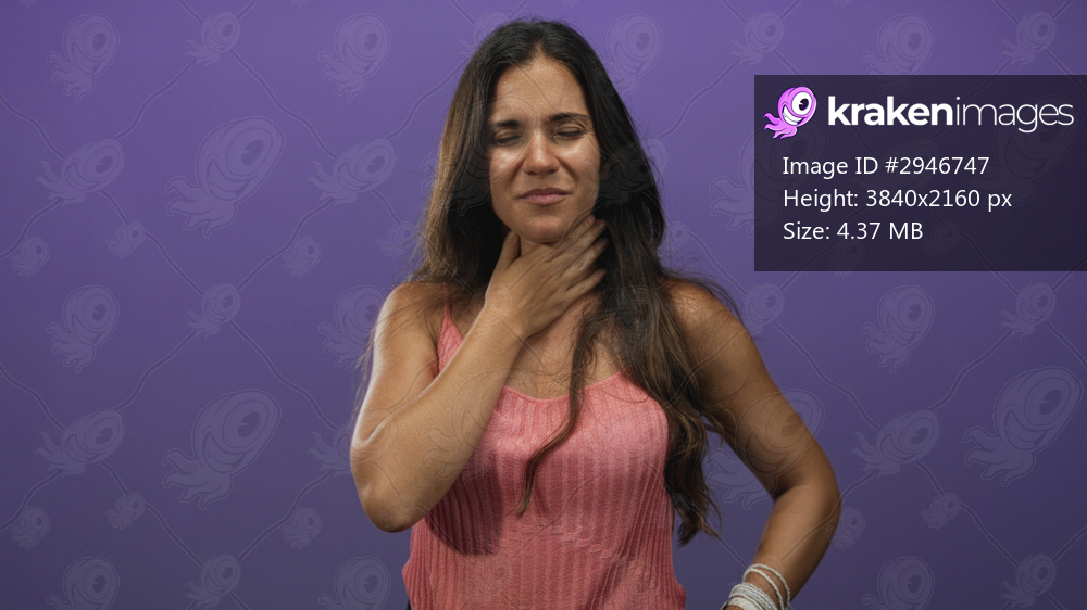 Young hispanic woman with hand on neck and eyes closed in studio with purple backdrop; sore throat pain.