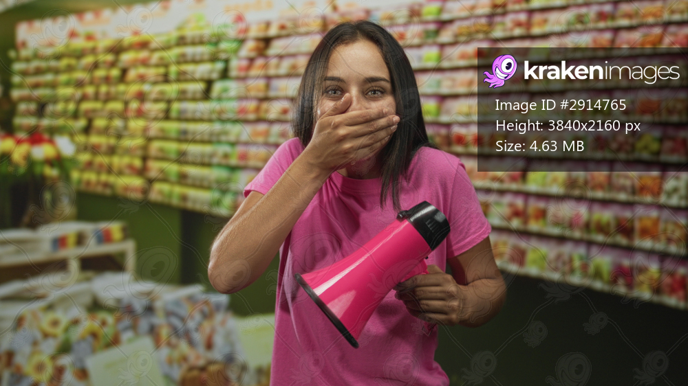 Young hispanic woman with hand over mouth holding pink megaphone inside building flower shop; joy playful fun.