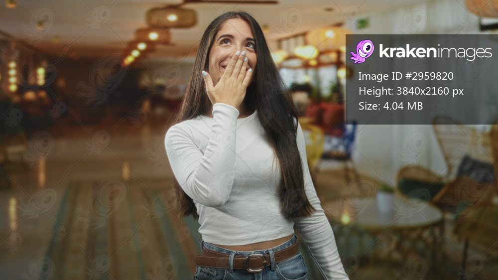 Young hispanic woman with hand over mouth smiling in a hotel lobby building wearing white top and jeans, casual pose; playful joy.