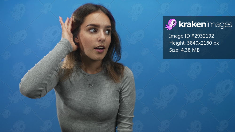 Young hispanic woman with hand to ear listening and slight smile, wearing grey shirt in studio against vivid blue wall; curiosity.