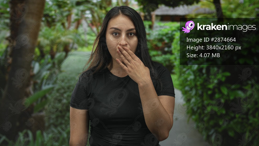 Young hispanic woman with hand to mouth on a shaded park pathway beside green hedges and tropical trees, holding the hand to mouth gesture; surprise hush. - Kraken Images