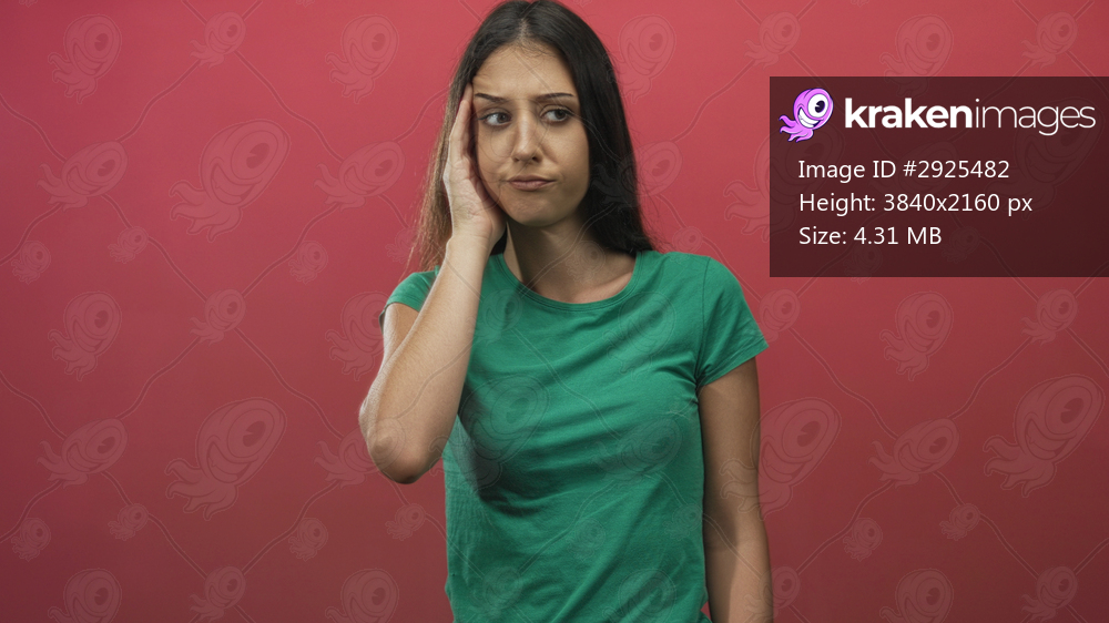 Young hispanic woman with hand to temple for headache and pained expression in studio against red backdrop; concern headache discomfort.