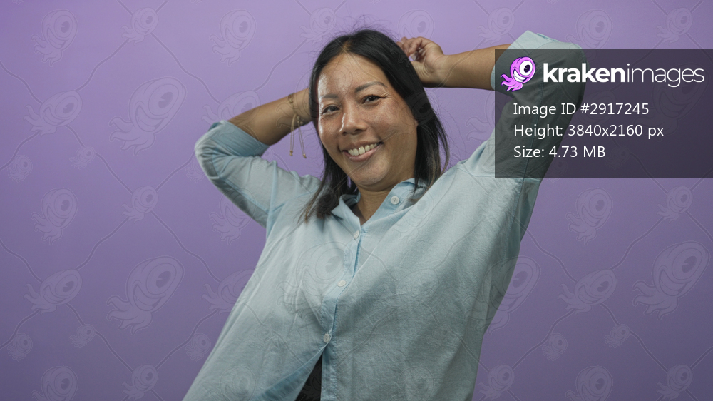 Young hispanic woman with hands behind head in purple studio wearing light blue shirt and bracelet, smiling with relaxed pose at camera; casual joy.