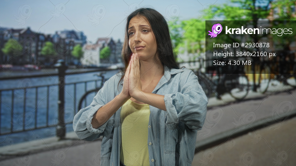Young hispanic woman with hands clasped in prayer and closed eyes on amsterdam street by canal railing, wearing denim shirt; hope plea.