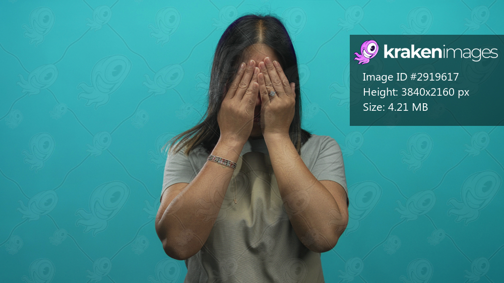 Young hispanic woman with hands covering face in turquoise studio wearing beige apron and gray tee; embarrassment vulnerability.