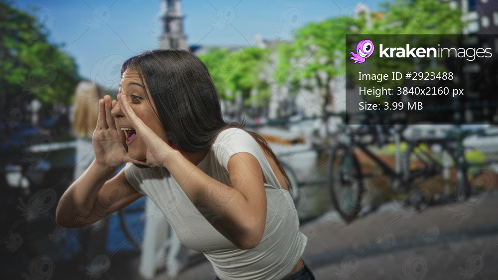 Young hispanic woman with hands cupped around mouth shouting on a street in amsterdam; excitement announcement.