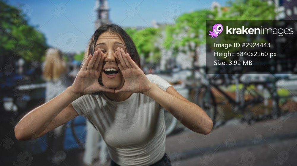 Young hispanic woman with hands cupped around mouth shouting on a street in amsterdam; excitement announcement.