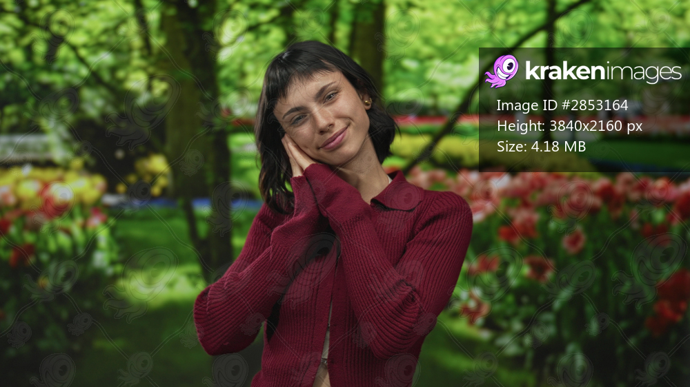 Young hispanic woman with hands forming heart gesture among blooming tulips in green forest in red sweater; affection.