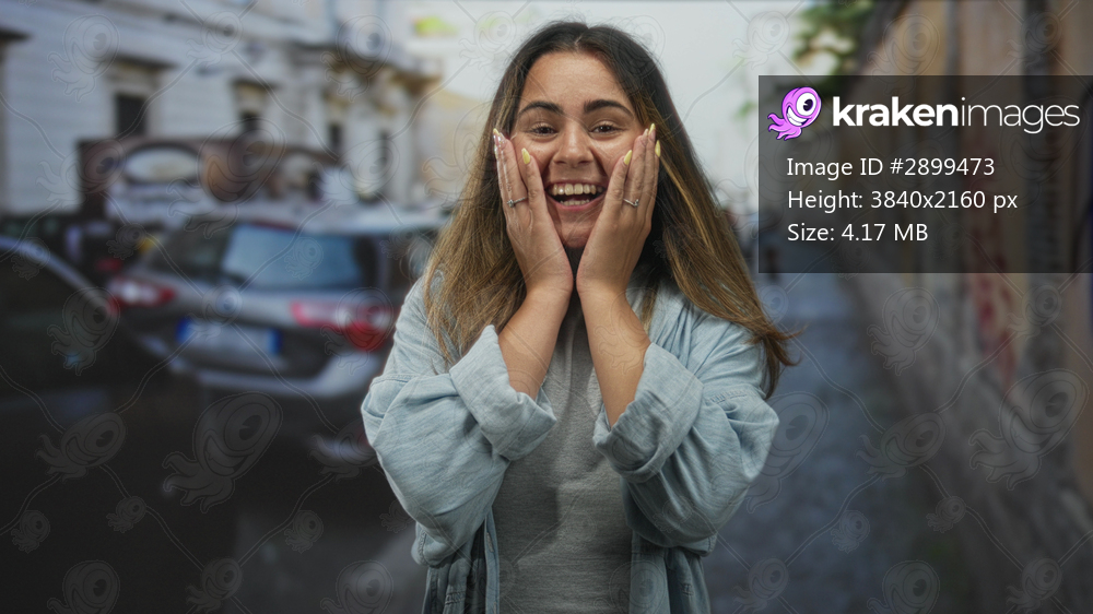 Young hispanic woman with hands on cheeks smiling on a city street between parked cars; surprise energy.