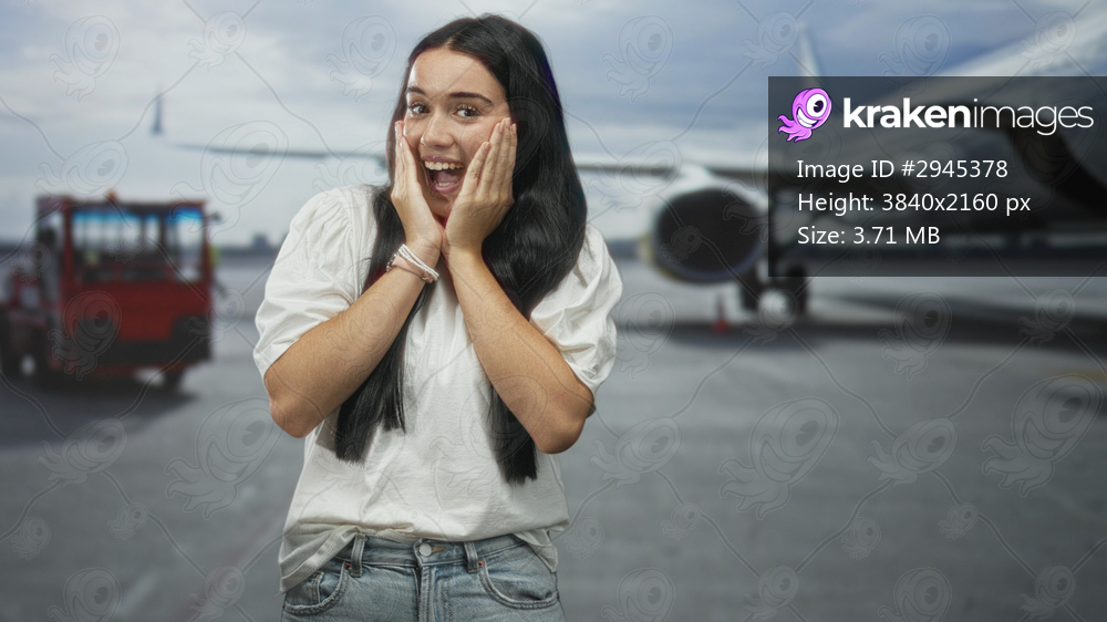 Young hispanic woman with hands on cheeks and surprised expression beside a jet airplane on an airport tarmac; travel excitement.