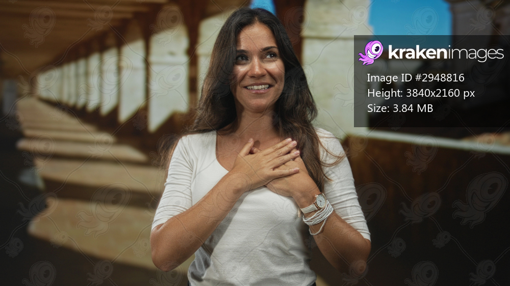 Young hispanic woman with hands on chest smiling in old town stone arcade building; gratitude warmth.