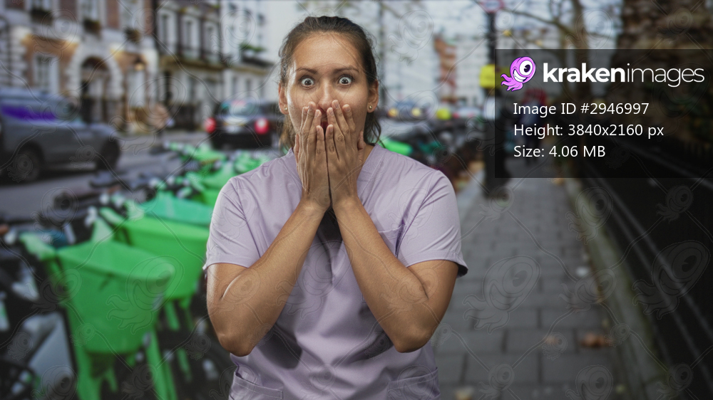 Young hispanic woman with hands pressed to cheeks beside green rental bike on street, mouth open gesture; surprise urban commute.