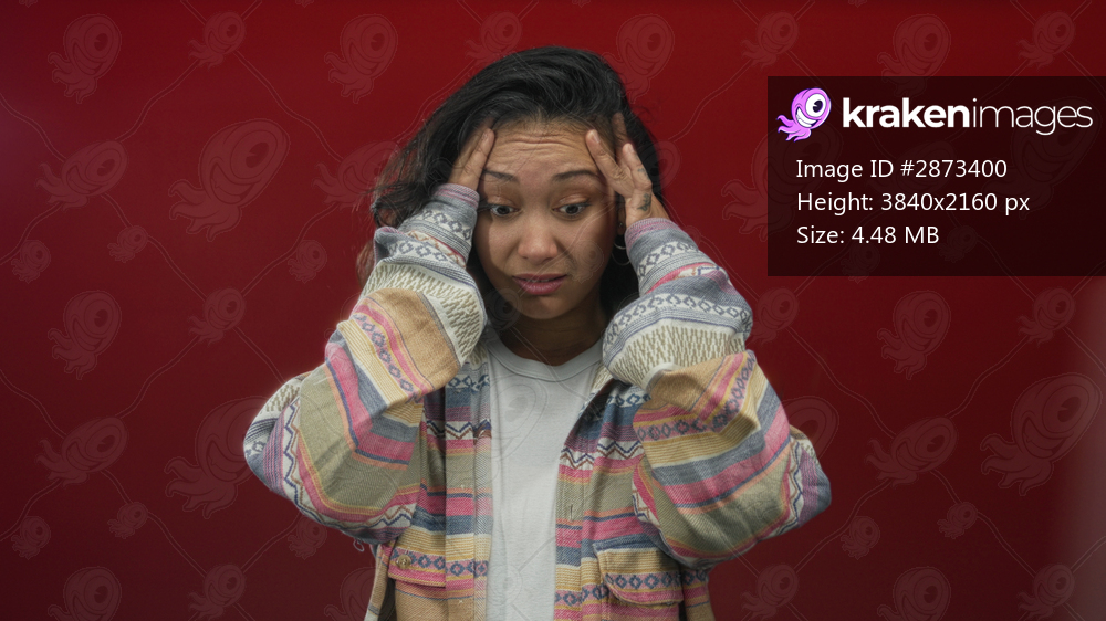 Young hispanic woman with hands pressed to temples in a red studio setting wearing a patterned jacket and white tshirt; stress headache.