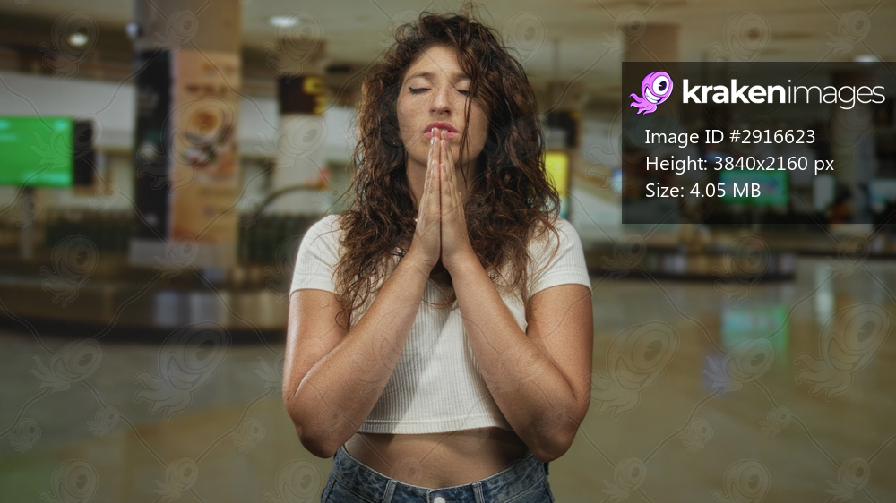 Young hispanic woman with hands pressed together in prayer at a busy airport terminal; hope reflection.