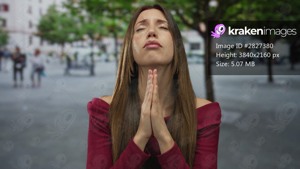 Young hispanic woman with hands pressed together in prayer gesture on bustling city street; faith hope.