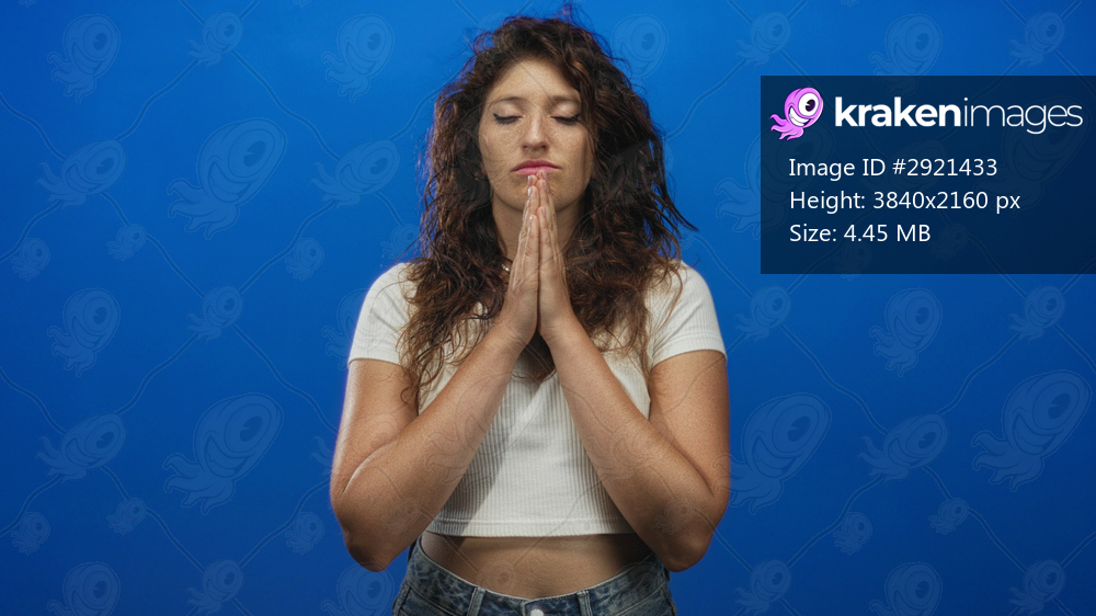 Young hispanic woman with hands pressed together in prayer in studio blue backdrop wearing white crop shirt and jeans, eyes closed; calm reflection.
