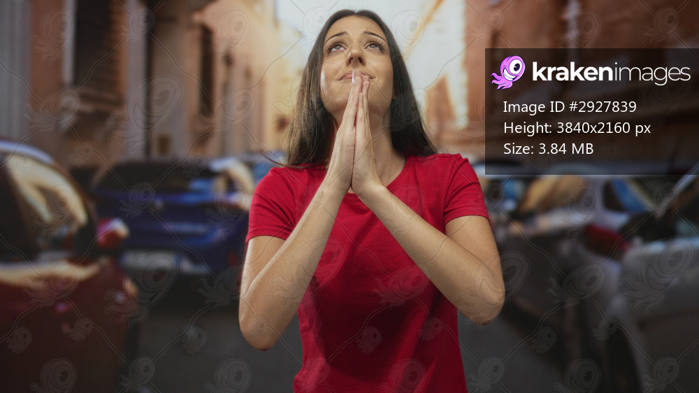 Young hispanic woman with hands pressed together in prayer on a sunlit street between parked cars; serenity gratitude.