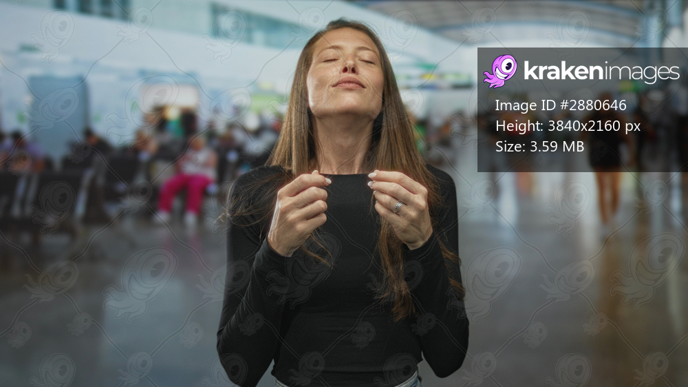 Young hispanic woman with hands raised gesturing and mouth pursed standing in a busy airport terminal among waiting travelers; calm contemplation.