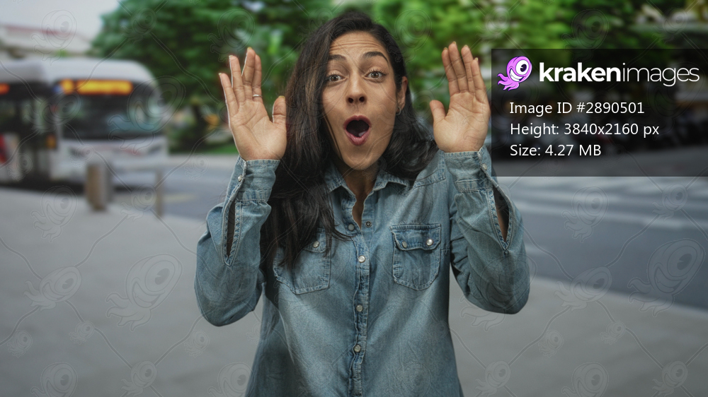 Young hispanic woman with hands raised and mouth open in denim shirt, bus behind her on street, palms shown and expressive face; surprise celebration.