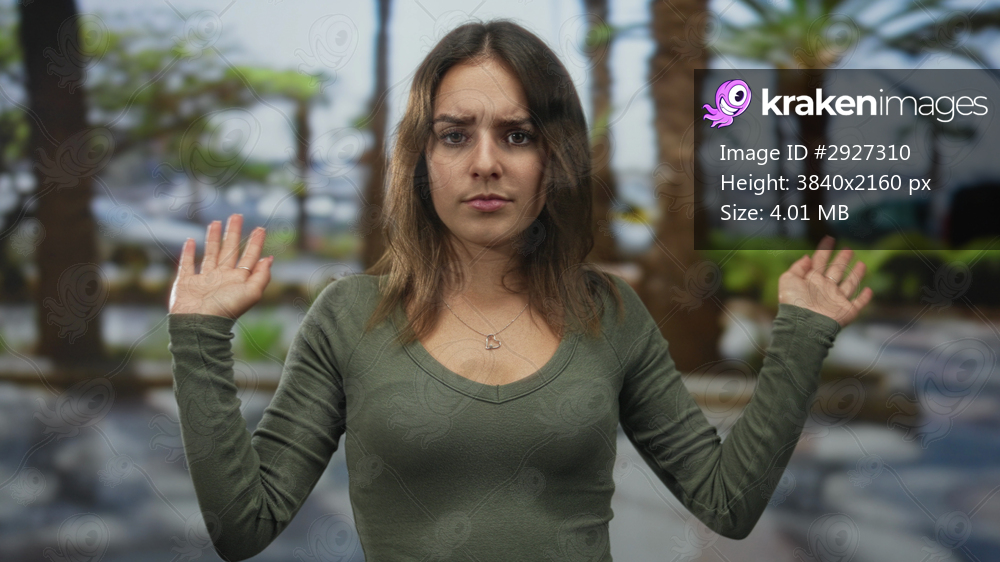 Young hispanic woman with hands raised palms up on street near palm trees and parked cars; resignation.