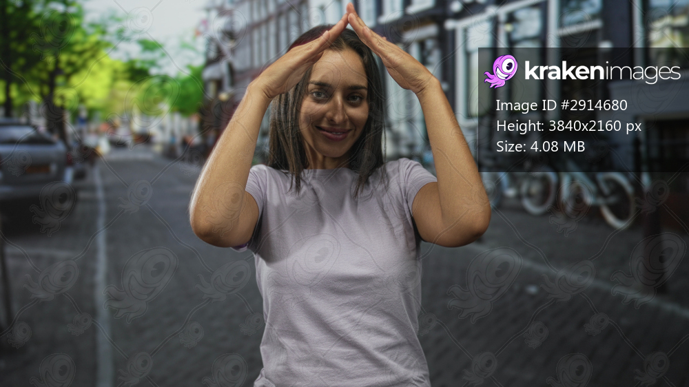 Young hispanic woman with hands raised and palms visible, standing on a cobblestone city street near parked bicycles and canal houses; confidence.