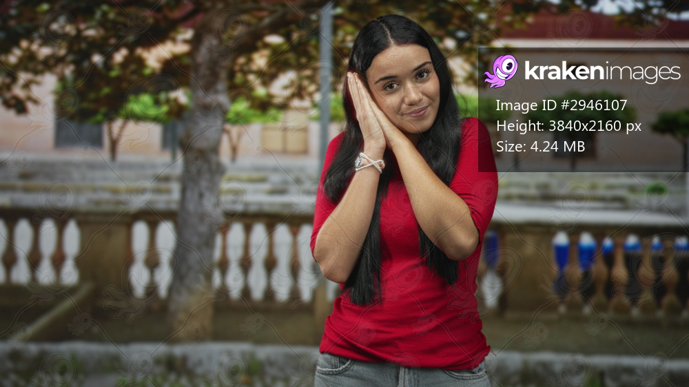 Young hispanic woman hands to cheek gesture wearing red top and jeans in front of building balustrade and steps; daydreaming contentment.
