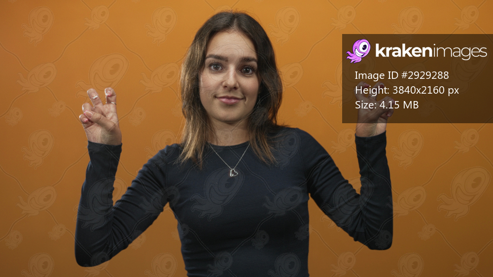 Young hispanic woman with heart pendant showing peace sign with both hands in studio against orange backdrop; playful confidence.