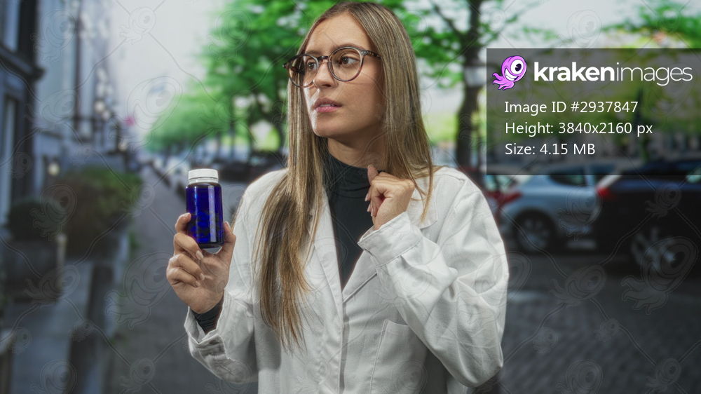 Young hispanic woman holding a blue glass bottle with hand on chin on city street, wearing lab coat and glasses; quiet contemplation.